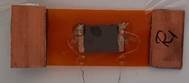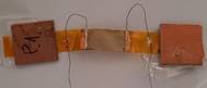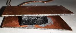 Aerogelurile obținute au fost decupate în bucăți de aproximativ 2 cm x 2 cm și contactate electric folosind două plăci de sticlotextolit cuprate. Pe suprafața de sticlotextolit a fost aplicat un strat de pastă conductivă de argint și a fost pusă în contact cu aerogelul de grafenă, precum în Figura 4. Pentru polimerizarea pastei de argint, dispozitivul a fost lăsat la temperatura camerei timp de 24 ore.