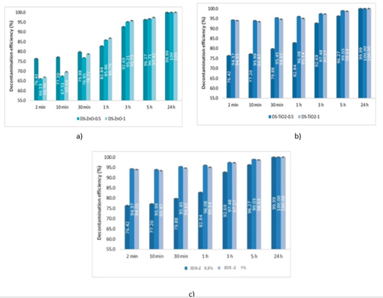 Eficienta de decontaminare chimica si biologica a fost testata pentru trei tipuri de solutie organica NANODEC RBC pe baza de nanoparticule sintetizate in cadrul proiectului si micro particule de zeolit natural extras in tara : 1DS-ZnO ; 2DS -TiO2 si 3DS –Zeolit Clinoptilolit, Fig. 1a, b, c.