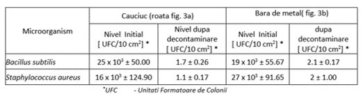 - Eficienta de decontaminare biologica a solutiei NANODEC-RBC a fost testata pentru cateva tipuri de microorganisme. Rezultatele testelor pentru cele trei tipuri de solutii care au fost dispersate utilizand sistemul mobil si adaptiv de mixare realizat in cadrul proiectului, pe diferite suprafete sunt prezentate in tabelul1 si Fig. 3a, b.