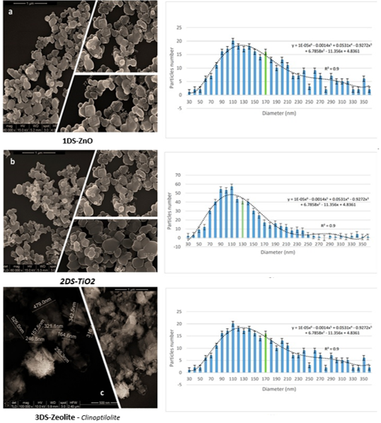 Fig.1 Caracteristicile dimensionale si distributia nanoparticulelor sintetizate functie de diametru: a) 1DS-ZnO, b) 2DS-TiO, c) 3DS-Zeolite, Fig 1a, b, c. 1 a, b, c. |