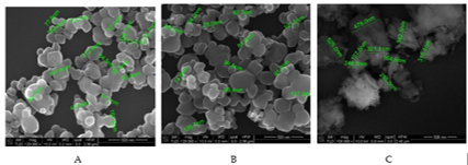 Fig. 2. SEM images of the NPs employed in the decontamination solutions: (A) – ZnO NPs; (B) TiO2 NPs; (C) Zeolite NPs;. |