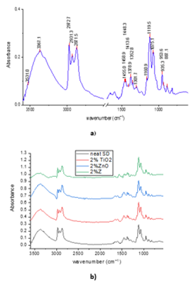 Comparative FT-IR plots for neat SD and for the decontamination solutions enriched with different concentrations of nanosized adsorbents are illustrated in Figure 2. The FT-IR analysis offers valuable information about the main groups present in the structure of the components from the decontamination solutions.
