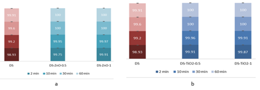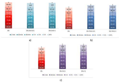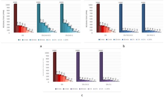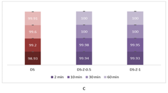 .Figure 4 – Decontamination degrees of sulfur mustard (HD) obtained for decontamination formulations containing: (a) ZnO, (b) TiO2 and (c) zeolite |
