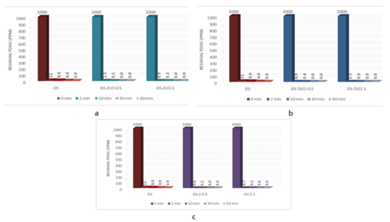The evaluation of the decontamination efficacy of the NPs-based decontamination solutions mustard gas (HD) (Figure 4) and soman (GD) (Figure 6). The remanant toxic concentrations are summarized in Figures 5 and 7, for HD and GD, respectively.