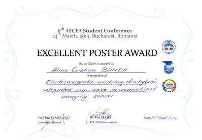 "Excellent Poster Award" was awarded to Alina Cristina Bunea (IMT Bucharest, L4) for "Electromagnetic modeling of a hybrid integrated mm-wave micromachined imaging sensor"