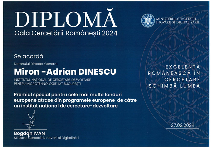 The Special Award for IMT Buchraest at 2024 Romanian Research Gala, an event organized by the MCID
