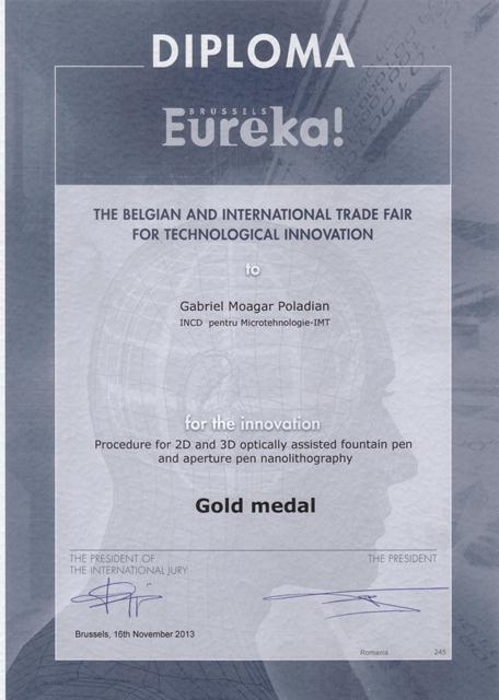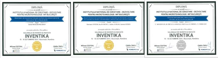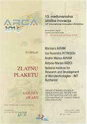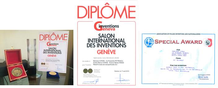 Gold medal and Special Award of SPWiR, Poland for the invention: Reagent based on gold nanoparticles, recipe for its preparation and its use for mapping of tumor tissue architecture, Authors: Marioara AVRAM, Ina Ruxandra PETRESCU, Andrei Marius AVRAM, Antonio Marian RĂDOI (IMT Bucharest, L10) |