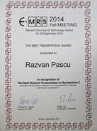 Best Paper Awards for Razvan Pascu (IMT Bucharest) at EMRS 2014 Fall Meeting, Warsaw, Poland.