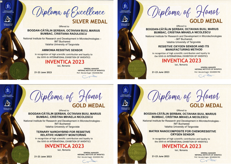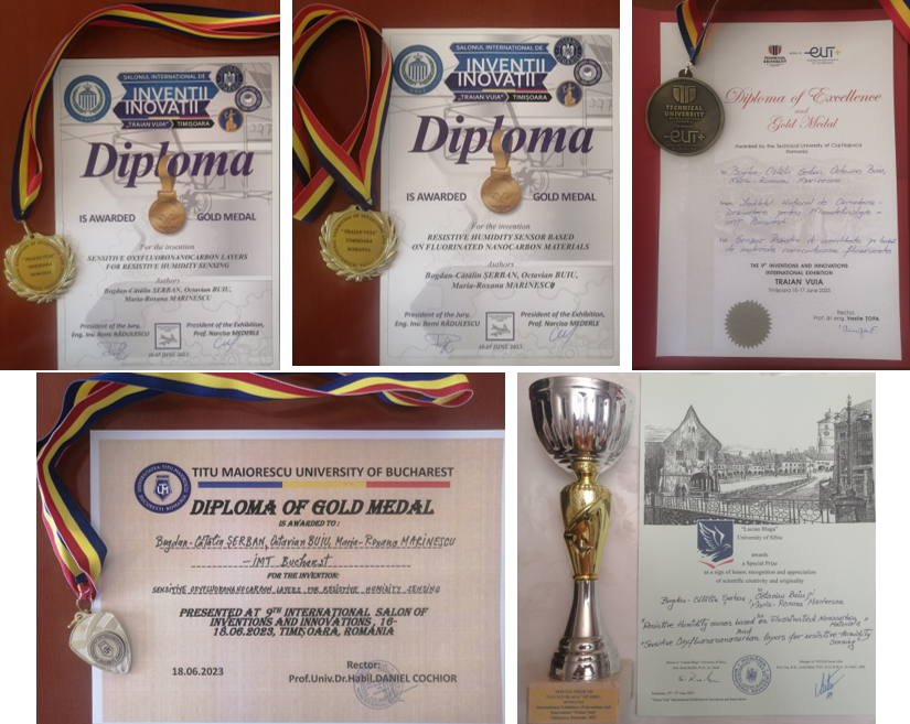 - Diploma and Gold medal for the invention Resistive humidity sensor based on fluorinated nanocarbon materials, Authors: Bogdan-Cătălin Șerban, Octavian Buiu, Maria-Roxana Marinescu