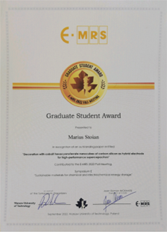 Best Paper Awards for Razvan Pascu, IMT Bucharest at EMRS 2014 Fall Meeting, Warsaw, Poland for “Hydrogen gas sensors based on silicon carbide (SiC) MOS capacitor structure”, with authors Razvan Pascu, Jenica Neamtu, Florea Craciunoiu, Gheorghe Brezeanu, Dragos Ovezea.