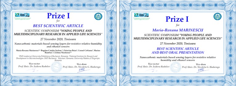 Special prize as a sign of honor, recognition and appreciation of scientific creativity and originality from “Lucian Blaga” University of Sibiu to Bogdan-Cătălin Șerban, Octavian Buiu, Maria-Roxana Marinescu for “Resistive humidity sensor based on fluorinated nanocarbon materials” and “Sensitive oxyfluoronanocarbon layers for resistive humidity sensing”.
