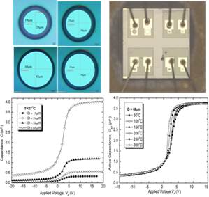 • A hump can be seen in the data, when the bias is swept from depletion to accumulation, due to electron trapping in interface states. The capacitor active area’s effect is evidenced. The temperature produces a negative voltage shift in the depletion region of the C-V curves, only. A proper stability of these characteristics for the whole measured temperature range is noted. |