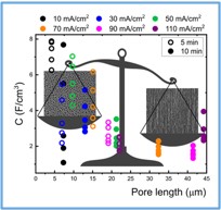 - In order to obtain the best supercapacitor when it comes to the level of porosity for Si electrodes, a balance must be found between the degree of porosity and pore length for too high of a current density would actually result in pore diameters too large and ultimately a lower porosity, while a long exposure time means losses and an unsatisfactory capacitive behavior.