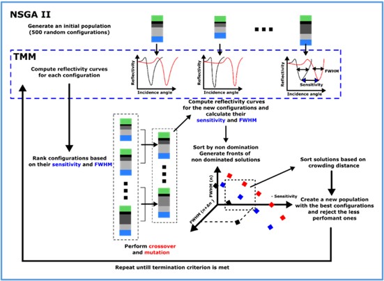- This study focused on overcoming these difficulties in the design process of sensors by employing a multi-objective genetic algorithm (NSGA II) alongside a transfer matrix method (TMM) and, at the same time, optimizing the sensitivity to full width at half maximum (FWHM), and the reflectivity level at a resonance for a four layer sensor structure.