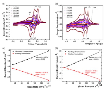 - A high texture coefficient is found to facilitate the insertion of charge, thus reaching a density of −73.30 and 70.76 mC cm−2 on coloration and bleaching, respectively. Moreover, a higher texture coefficient induces a higher transmittance contrast under an applied voltage of ±1 V, reaching 18.48% for the most textured sample.