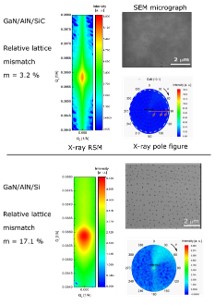 - The effect of the lattice mismatch in the dislocation density in heteroepitaxial GaN layers was assesed using X-ray reciprocal space maps, which show different broadening of the GaN spot.