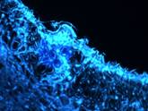 UV fluorescence microscopic image of the cryosections of B16 melanoma margins after uptake of AuSPION, with well defined border and high fluorescence in epidermis and intracellular in plasma lemma, but not in cell nucleus (x 60).