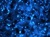 UV fluorescence microscopic image (Nikon) of B16 melanoma after uptake of AuSPION . The image is shifted from green to blue due to the uptake of gold nanoparticles (x 60)