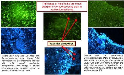 In the scattering images, the gold coated maghemite nanoparticles surrounded by melanoma can be seen as bright blue areas in UV light and as bright green areas in visible light. |