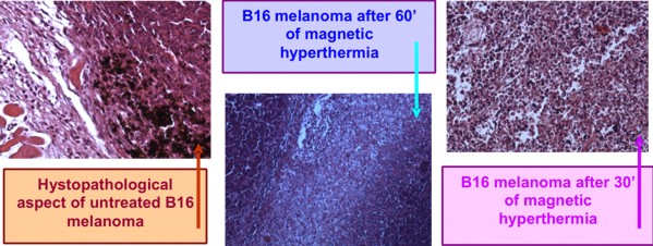The synthesised gold coated maghemite superparamagnetic nanoparticles were successfully used in mid-range alternating magnetic fields for magnetic hyperthermia treatment of mice B16 melanoma and in hystopathological investigation of the melanoma, after injecting gold coated maghemite superparamagnetic nanoparticles, using UV fluorescence .