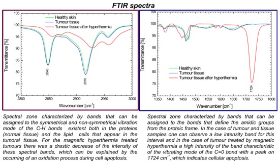 The intensity in this spectral bands increases very much for tumour tissues and the intensity is low for skin and for the melanoma post-magnetic hyperthermia, so suggesting tissue recovery. The intensity in about 800 cm-1 spectral range decreases dramatically for tumours |