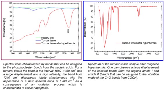 The apoptosis of B16 melanoma cells was studied by UV and FTIR spectrometry. This allows us to identify the superficial chemical bonds of the samples: healthy tissue, untreated melanoma, and magnetic hyperthermia treated melanoma. Four important spectral domains of interest were identified: 1) 3000-2800cm-1, this domain is characterized by spectral bands which can be attributed to the C-H vibration mode appearing both in tissue proteins and lipid cells found in the fresh tumour; for the magnetic hyperthermia treated tumours there was a drastic decrease of the intensity of these spectral bands, which can be explained by the occurring of an oxidation process during cell apoptosis. 2) 1800-1350cm-1, this domain is characterized by spectral bands which can be attributed to amidic groups from the protein skeleton; for the magnetic hyperthermia treated tumours there was a drastic shift of these spectral bands. At the same time another spectral band appeared, having a maximum centred on 1724cm-1, which indicates cellular apoptosis. 3) 1350-900cm-1, this domain is characterized by spectral bands which can be attributed to phosphodiester bonds in nucleic acids; this area offers the most relevant characterization of cellular apoptosis. For the magnetic hyperthermia the spectral band found at 1080-1030cm-1 shifts and increases in intensity (P=O), the spectral band found at 1240cm-1 disappears completely, while a new spectral band appears at 1283cm-1 as a consequence of an oxidation process which is characteristic to cellular apoptosis. 4) 900 – 500 cm-1, the intensity in this spectral bands increases very much for tumour tissues and the intensity is low for skin and for the melanoma post-magnetic hyperthermia, so suggesting tissue recovery. The intensity in about 800 cm-1 spectral range decreases dramatically for tumours.