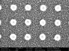 SEM micrographs of 18 nm diameter (left) and 79 nm diameter (right) holes in PMMA, fabricated by EBL |