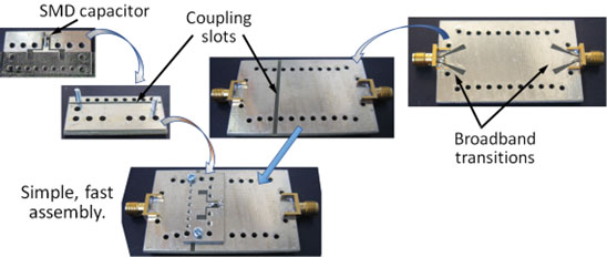 Circuitul SIW secundar se asamblează peste circuitul SIW principal, prevăzut cu conectoare SMA, astfel încât fantele lor de cuplaj să se suprapună (Fig. 1). Menţinerea unei poziţii stabile între circuitele asamblate este asigurată prin utilizarea a cel puţin două perechi şurub-piuliţă amplasate de o parte şi de alta a zonei de cuplaj. In partea superioară a figurii pot fi observate ambele feţe ale fiecărui circuit imprimat utilizat în această aplicaţie.