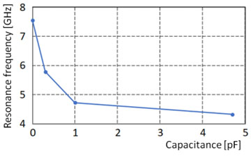 Capacitoare SMD cu valori cuprinse între 0 pF şi 4,7 pF au fost asamblate ca impedanţe de sarcină pentru circuitul SIW cuplat. Caracteristica de transfer a întregii structuri prezintă un minimum de transmisie (la frecvenţa de rejecţie), în funcţie de valoarea acestui capacitor. Frecvenţele de rejecţie au fost cuprinse între 4,32 GHz pentru capacitorul de 4,7 pF, şi 7,56 GHz pentru linia CPW terminată în gol, echivalentă cu un capacitor de 0 pF (Fig. 2). Gama frecvenţelor de rejecţie poate fi modificată prin alegerea copnvenabilă a lungimii electrice echivalente a circuitului SIW cuplat.