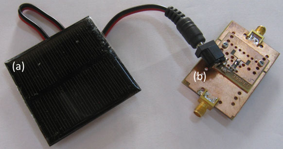 Fig. 1. Photo of the resonant sensor assembly for measuring light intensity: the solar panel (a) is used as basic sensing device (a) connected to the microwave assembly (b) with the resonance frequency proportional to the light intensity incident on solar panel surface. The complete structure of the resonant sensor for determining the intensity of light radiation is shown in Fig. 1, where the two constituent elements are shown: (i) the solar panel (a), which is the actual sensor of the system, and (ii) the tunable SIW resonant circuit with varicap diodes. It can be seen that the microwave circuit associated with the sensor has a compact structure, due to the use of removable SIW circuit assembly. The determination of the microwave operating frequency (rejection) of the resonant structure dependence on light intensity was performed by connecting it to a wideband vector network analyzer (VNA). Sensor characterization was performed by exposing the solar panel to a light source with uniform and controlled light intensity distribution (ORIEL LSH-7320 ABA LED solar simulator). Since the light intensity available from the solar simulator (between 0.1 - 1 sun) proved to be too high for our solar panel model, a 50 dB broadband optical attenuator was inserted in between. |