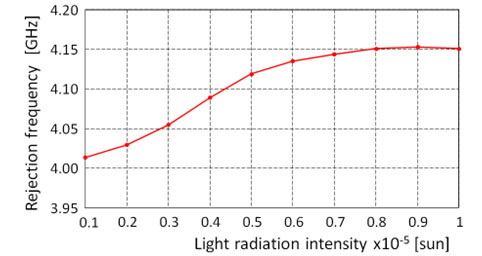 Fig. 2. Frequency response of the sensor shown in Fig. 1 vs light radiation intensity. The measured minimum (3.9794 GHz) and maximum (4.1509 GHz) resonance frequencies for the sensor indicate a deviation of 137.2 MHz, i.e. a relative bandwidth of operation of about 4.22% obtained for the light intensity variation between 10-6 sun and 10-5 sun (Fig. 2).