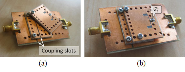 Fig. 3. Assembly of three electromagnetically coupled SIW circuits providing multiple frequency tuning possibilities, with visible intermediate tuning circuit (a), and after complete assembly, for microwave measurements with various load impedance (ZL) values (b). An experimental model with complex assembly of three coupled SIW circuits is shown in Fig. 3. Functionally, the intermediate coupled SIW circuit, actually a three LaTE structure [Details] is used for step-wise change of the structure’s operating frequency. The upper SIW circuit is provided with an SIW-CPW transition at the end of which any SMD component can be assembled, the type and value of which simulates the behaviour of a high-frequency sensor with reactive behaviour.