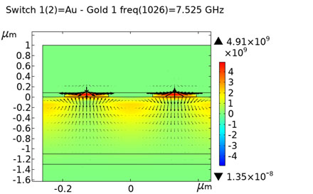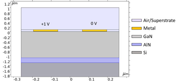 The first stage of the SAWSAT project corresponds to Task. 1.1. Multiphysics piezo-electro-mechanical modeling of SAW resonators. The main result was the development of multiphysics models for the study of the propagation modes and the effect of superstrate layers. 2D multiphysics models of the surface acoustic wave (SAW) transducers were developed using the “Solid Mechanics” and “Electrostatics” modules, coupled through the “Piezoelectric Effect” module in COMSOL Multiphysics. A detailed analysis was performed in order to determine the propagation modes and resonance frequencies of transducers with 130 nm space and width and 80 nm metal thickness for four metallization types, namely titanium (Ti), gold (Au), aluminum (Al) and chromium (Cr). Additional studies were conducted on the effect of the metal layer thickness, GaN substrate thickness, as well as the effect of zinc oxide (ZnO), silicon dioxide (SiO2) and silicon nitride (Si3N4) superstrates.