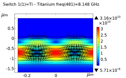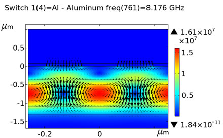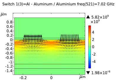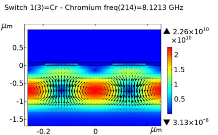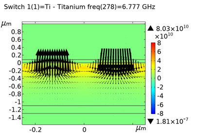 Von Misses stress distribution (color) and displacement field (arrows) at the resonance frequency for the first order Sezawa propagation mode: (a) gold transducers @8.155 GHz; (b) aluminum transducers @8.176 GHz; (c) chromium transducers @8.121 GHz; (d) titanium transducers @8.148 GHz