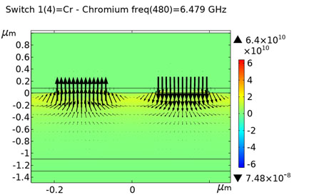Von Misses stress distribution (color) and displacement field (arrows) at the resonance frequency for the Rayleigh propagation mode: (a) gold transducers @7.525 GHz; (b) aluminum transducers @7.02 GHz; (c) chromium transducers @6.479 GHz; (d) titanium transducers @6.777 GHz.
