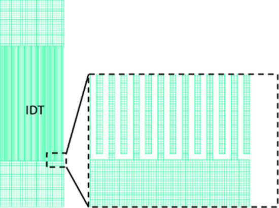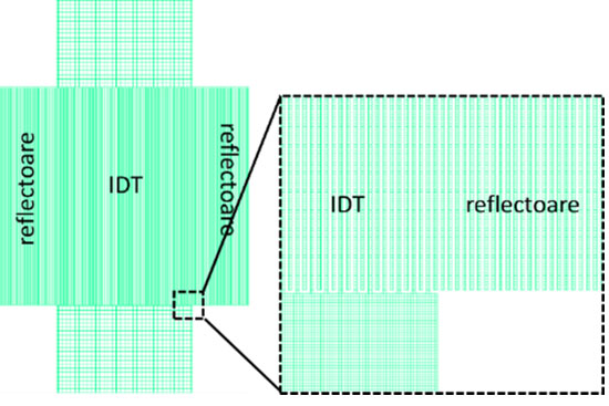 Test SAW structures consisting of transducers with 130 nm, 135 nm and 150 nm digit/interdigit were designed. Interdigital transducers (IDT) with and without reflectors, as well as configurations for acoustic wave transmission at different distances in symmetric and antisymmetric topologies were designed. This was followed by the design of the connecting microwave circuit, based on 50 Ohm characteristic impedance coplanar waveguide transmission line sections, with a layout geometry designed to accommodate the three-pin on wafer ground-signal-ground (G-S-G) measurement probes.