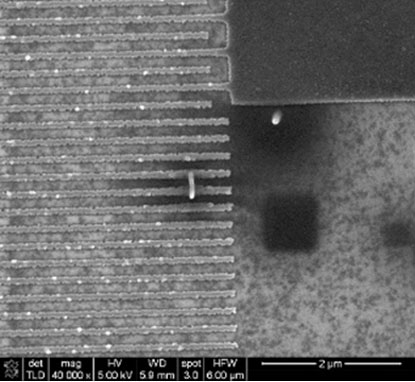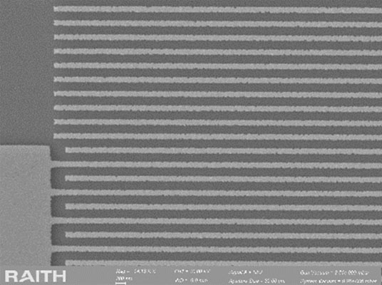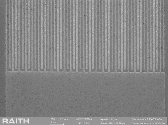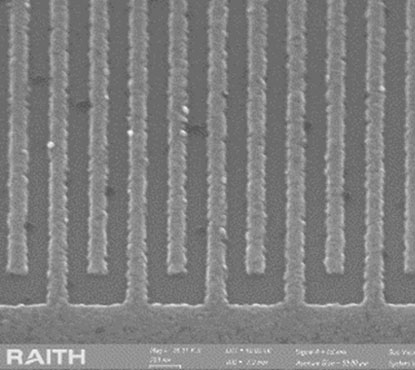 Test devices with 50 nm Ti, 5 nm Ti + 50 nm Au, 50 nm Al si 50 nm Cr IDTs were manufactured using a combination of photolithographic and electron beam lithography processes. The test structures were characterized microstructurally by means of a scanning electron microscope (SEM) and in the microwave domain, using a vector network analyzer with on wafer contacting measurement station. Calibrated scattering (S) parameter measurements were performed and the corresponding transmission and reflection parameter curves were plotted.