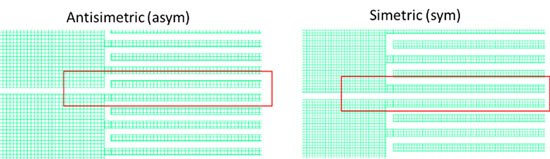 Design of SAW resonator test structures: (a) interdigital transducer without reflectors; (b) interdigital transducer with reflectors; (c) antisymmetric and symmetric topologies