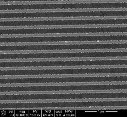 SEM images of fabricated SAW resonators: (a) with 130 nm wide gold transducers; (b) with 130 nm chromium transducers; (c) with 130 nm titanium transducers; (d) with 130 nm aluminum transducers