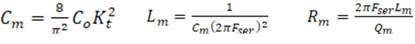 Optimization methods were employed for the equivalent model parameter extraction for the SAW resonators placed in series with CPW transmission line segments, based on the modified Butterworth van Dyke equivalent circuit. The extracted parameters are the series resonance frequency (fser), the electromechanical coupling factor (kt2), the quality factor (Q), the static capacitance of the resonator (Co), the dielectric losses (Ro) and the conduction losses (Rs). The other parameters are calculated based on the analytical relations given below.