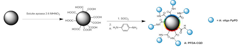 The method of synthesis, schematically presented below, has followed our previous approach – starting from commercial carbon nanoparticles of diameters below 50 nm. After oxidation, the surface of the carbon nanoparticles was treated in thionyl chloride, with a subsequent amidation reaction by two types of amine terminated derivatives (e.g. p-phenylenediamine) to yield pPD-CDs. The synthesis was carried out under argon atmosphere for 3 days with the successive size separation on Sephadex.