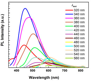 The synthesized carbon dots exhibited the characteristic excitation-dependent emission (Fig. 2) with a broad emission and emission centered at 450 nm for pPD-CDs. In addition to the intense excitation-dependent emission, with shifting the excitation wavelength above 420 nm, there is a fixed emission centered at around 570 nm.