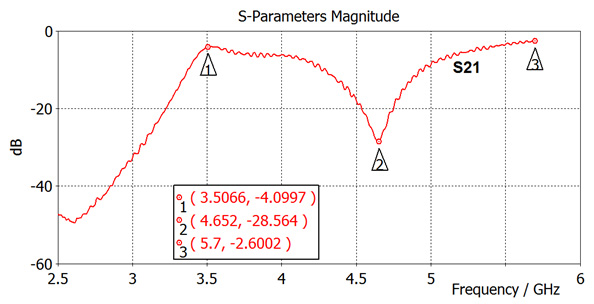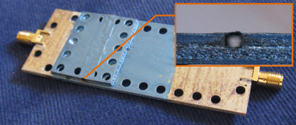 Modelul de celulă de măsură realizat experimental este prezentat în Fig. 3. Se pot observa (i) SIW principal, prevazut cu două tranziţii la liniile coplanare de intrare şi ieşire care au ataşate conectoare SMA, şi (ii) segmentul SIW care îndeplineşte funcţia de rezonator. Inserţia eşantionului care trebuie măsurat se face printr-un canal cu dimensiuni maxime de cca. 1,6 mm x 1,6 mm (conform detaliului din figură). Răspunsul în frecvenţă al celulei de măsură cu cavitatea neperturbată (fără inserţie de material dielectric – Fig.4 ) arată o atenuare la rezonanţă de aproximativ 28,56 dB, frecvenţa de rezonanţă fiind 4,652 GHz.