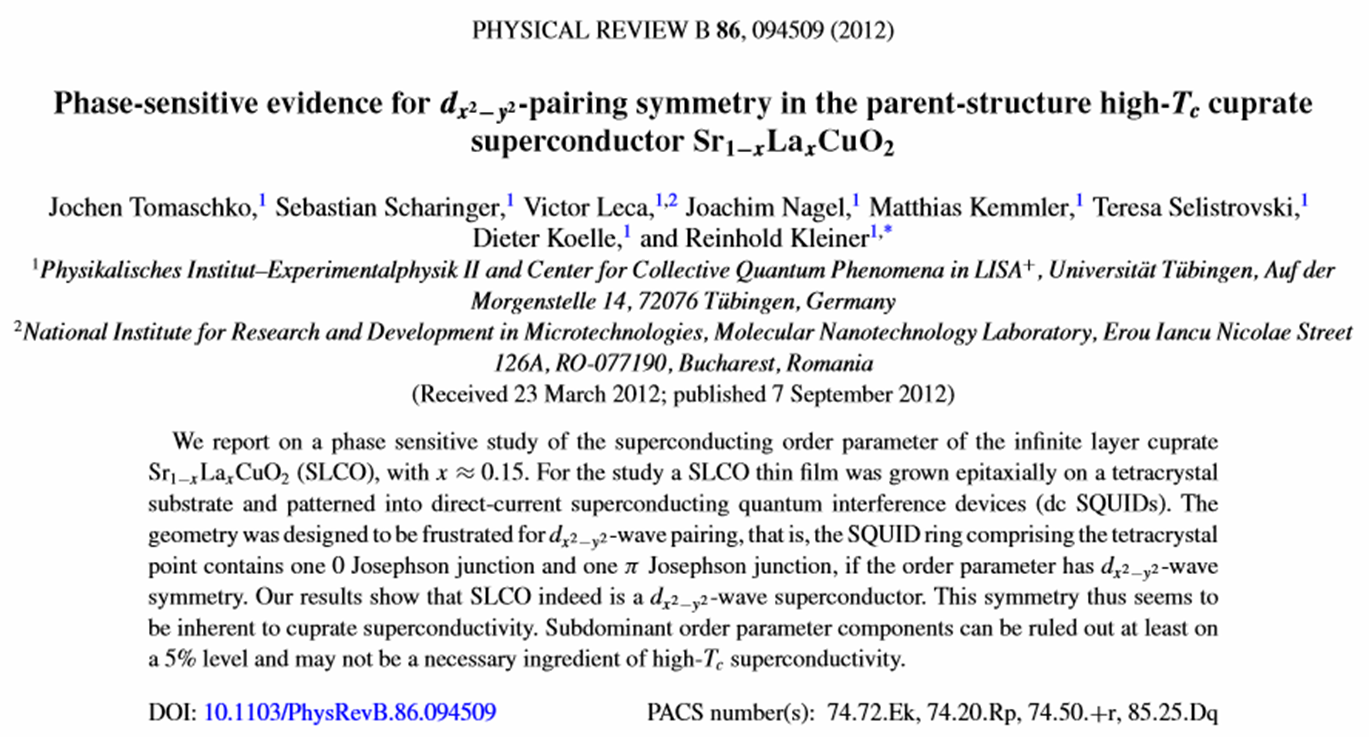 - J. Tomaschko, S. Scharinger, V. Leca, J. Nagel, M. Kemmler, T. Selistrovski, S. Diebold, J. Jochum, R. Kleiner, and D. Koelle, Phase-sensitive evidence for dx2-y2 pairing symmetry in the parent-structure high-Tc cuprate superconductor Sr1-xLaxCuO2, Physical Review B 86, 094509 (2012) [download paper]