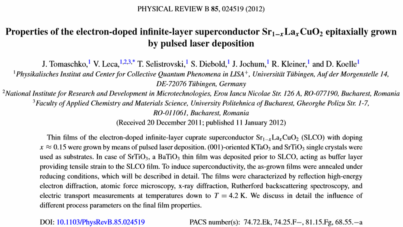 - J. Tomaschko, V. Leca, T. Selistrovski, S. Diebold, J. Jochum, R. Kleiner, and D. Koelle, Properties of the electron-doped infinite-layer superconductor Sr1-xLaxCuO2 epitaxially grown by pulsed laser deposition, Physical Review B 85, 024519 (2012) [download paper]