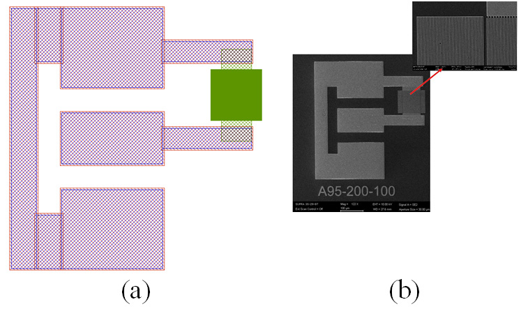Fig. 1 (a) Layout SAW “single resonator” (b) Imagine SEM a structurii SAW: cipul cu paduri de tip ghid de undă coplanar; în captură este prezentat un detaliu al procesului nanolitografic. |