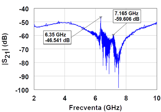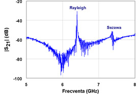 Pentru realizarea acestui obiectiv au fost utilizate structuri SAW de tip “face to face” depuse pe GaN/Si avand o lățime a digitului si a interdigitului (pentru traductorul interdigitat) de 170 nm. In figura 5 sunt prezentati parametrii de reflexie si de transmisie ai structurii SAW analizate. Se poate observa ca frecventele corespunzatoare modurilor de propagare Rayleigh si Sezawa sunt apropiate, avand valorile de 6,39 GHz, respectiv 7,37 GHz. Am observat o imbunatatire in ceea ce priveste pierderile in transmisie: -30 dB pentru modul Rayleigh si -51 dB pentru modul Sezawa, mai mici decat ce s-a obtinut in run-ul anterior (-46 dB pentru modul Rayleigh si -60 dB pentru modul Sezawa), figura 5.