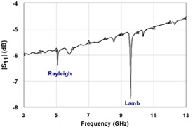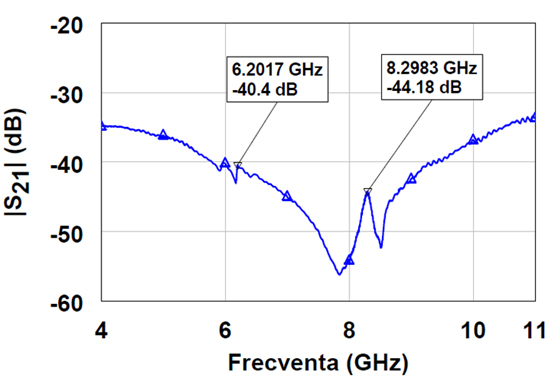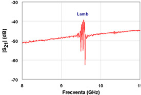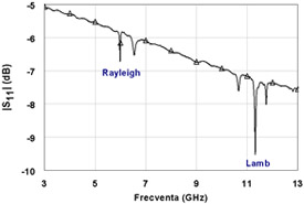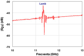 Caracteristicile de răspuns (masuratori de S11 si S21) ale structurilor SAW de tip “face to face” pe membrana de GaN pentru lățimi digit/interdigit ale traductorului interdigitat de 200 nm, respectiv 170nm, sunt prezentate în figurile 6 si 7. Se poate observa aparitia modului de propagare superior Lamb, specific structurilor SAW realizate pe membrane, la o frecventa de 9.58 GHz, respectiv la 11.32 GHz.