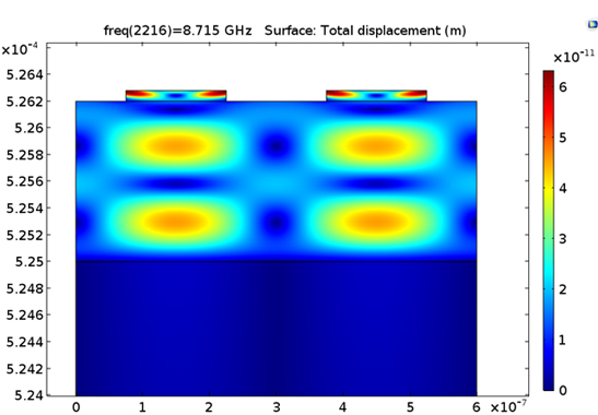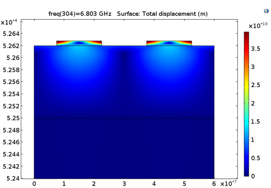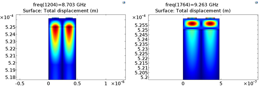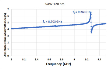 Figura 4 reprezinta modulul admitantei in functie de frecventa extras pentru structura SAW cu IDT avand 120 nm latimea digitilor/spatiilor interdigitate si grosimea metalizarii de Au de 100 nm. S-au obtinut 2 frecvente de rezonanta corespunzatoare modului de propagare Rayleigh (f = 8.7 GHz) si modului Sezawa (f=9.26 GHz). Formele de unda corespunzatoare sunt prezentate in Fig. 5. In cazul frecventei de rezonanta Rayleigh deplasarea are valoarea maxima in electrozi si in stratul de GaN. In cazul modului de propagare Sezawa, deplasarea maxima este in electrozi si in stratul de GaN, patrunzand in substratul de Si 0.3 µm.