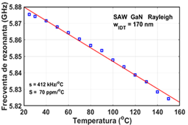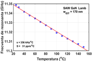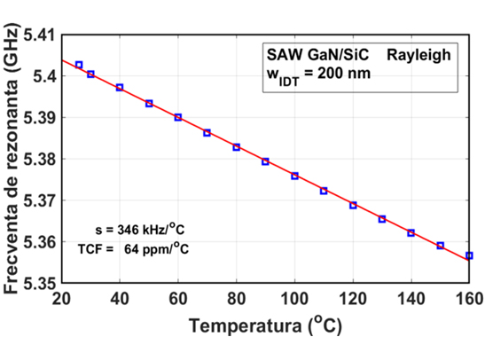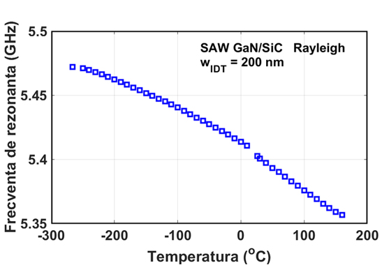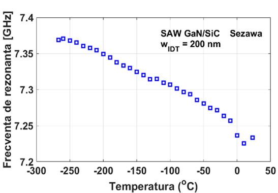 Variația frecvenței de rezonanță (modul Rayleigh) în funcție de temperatură a fost măsurată în intervalul de temperatură de la -266°C la 160°C pentru structuri SAW realizate pe plachete de GaN/SiC cu latimea spatierea digit/interdigit de 200 nm. S-a extras senzitivitatea de 346 kHz/°C (Fig 6).